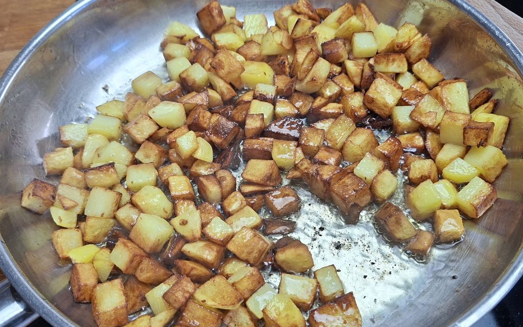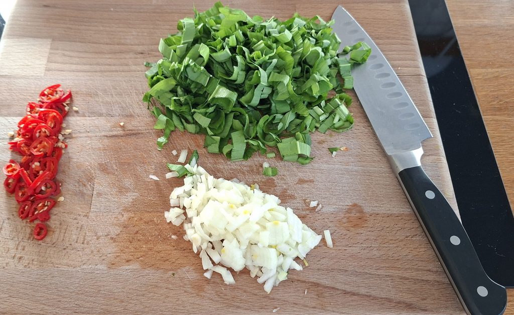 Das Gemüse wird klein geschnitten und kommt in die Pfanne mit Öl. Dazu kommen Kräuter und Gewürze. Hätte ich beim Campen einen Deckel für die Pfanne gehabt, hätte ich alles darunter garen lassen. Ohne Deckel musste ich bei mittlerer Hitze alles häufiger in der Pfanne wenden.