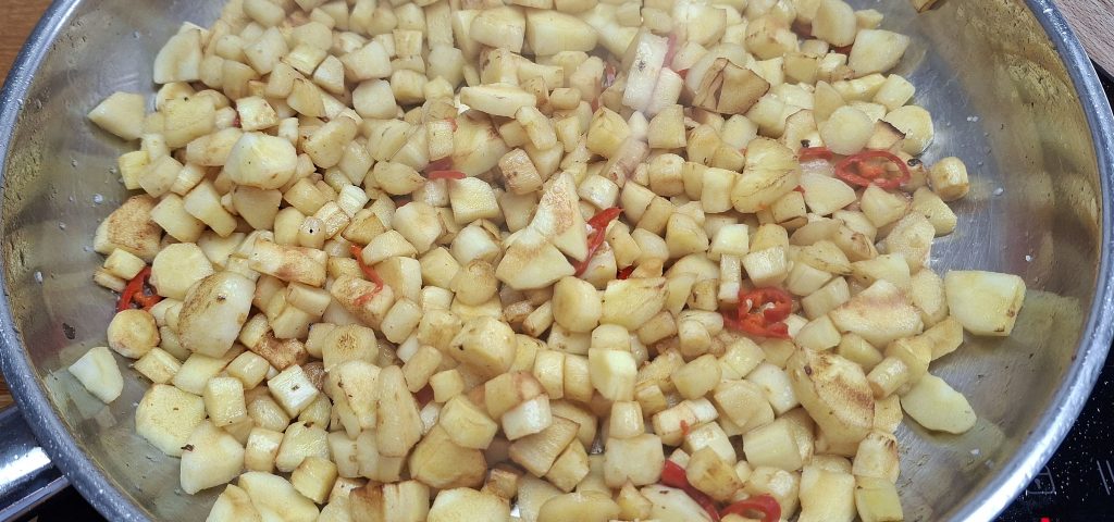 Die Pastinaken frittierst bzw. brätst Du in Öl, bis sie knusprig braun sind. Ich habe auf dem Bild zu viele Stücke in der Pfanne. Dann brauchen die Stückchen zu lang und werden leicht matschig statt braun. Das knusprige Braune schafft im fertigen Gericht ein zweite Textur zu den weichen Kürbisstückchen. (Wenn man nicht so wie ich bei diesem ersten Versuch die braunen Knusperstücke vor dem Orangensaft dazu gibt…) Die braunen Pastinaken werden mit einem Schaumlöffel oder ähnlichem aus der Pfanne gefischt und in ein Metallsieb zum Abtropfen gegeben und zur Seite gestellt.