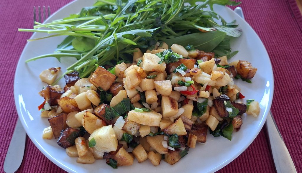 Die knusprigen Pastinakenstücke kommen fast zuletzt dazu und werden nur noch kurz durchgewärmt – sie sollen knusprig bleiben. Über das Gericht kommen zuletzt Flocken von den geriebenen Schalen der Zitrusfrüchte.